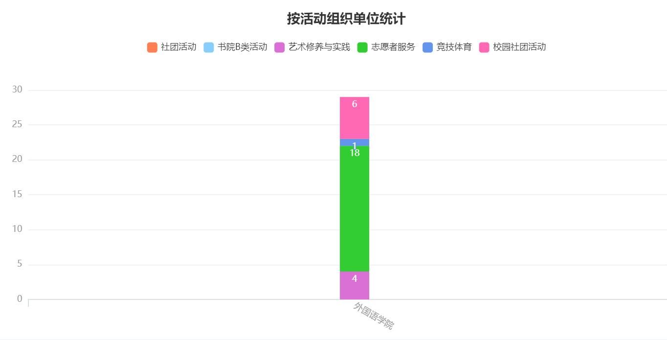 蹴就着三月滚烫的完满教育,外国语学院的数据分析也实时更新。外国语学院共推出28场完满教育特色活动,其中校园社团活动5场,艺术修养与实践4场,志愿者服务18场,竞技体育1场,覆盖人数约980人次,活动平均人数约776人次。外国语学院三月数据分析报告如下: