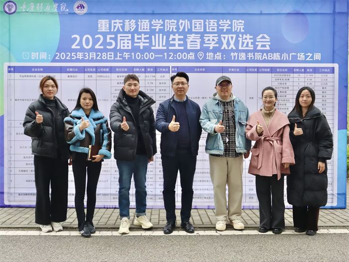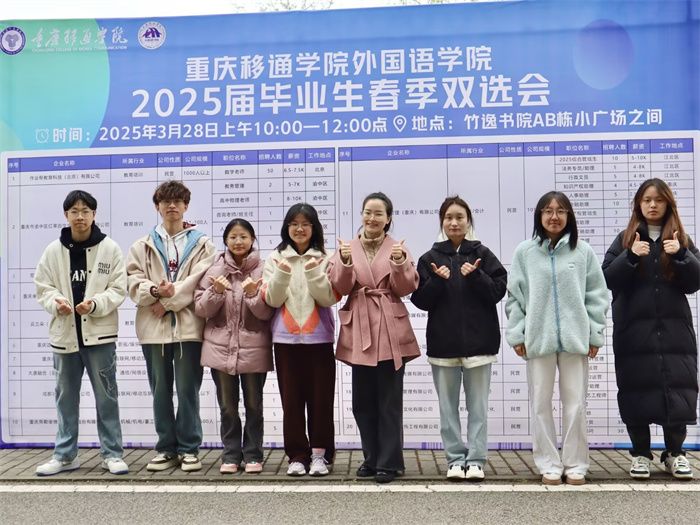 为加强对学生的就业指导,帮助同学找到适合的就业岗位,拓宽就业渠道,提升移通学子的就业竞争力。重庆移通学院外国语学院承办的2025届毕业生春季专场招聘会于3月28日中午圆满落幕,此次双选会吸引20家知名企业参与,覆盖电商、辅导教师等多领域。通过搭建校企双选平台,助力外院学子精准对接岗位需求,同步开展简历指导、职业规划等就业服务。