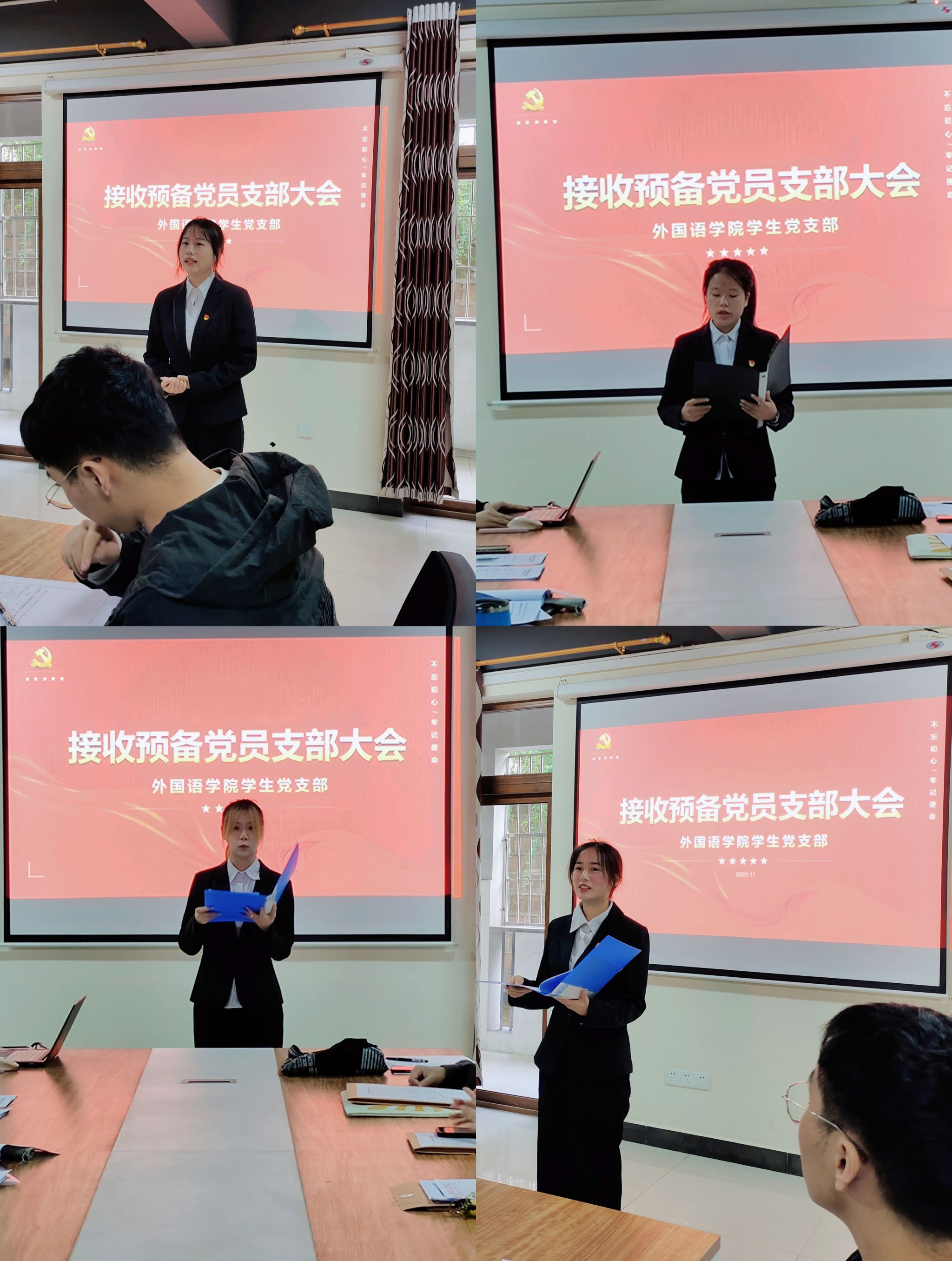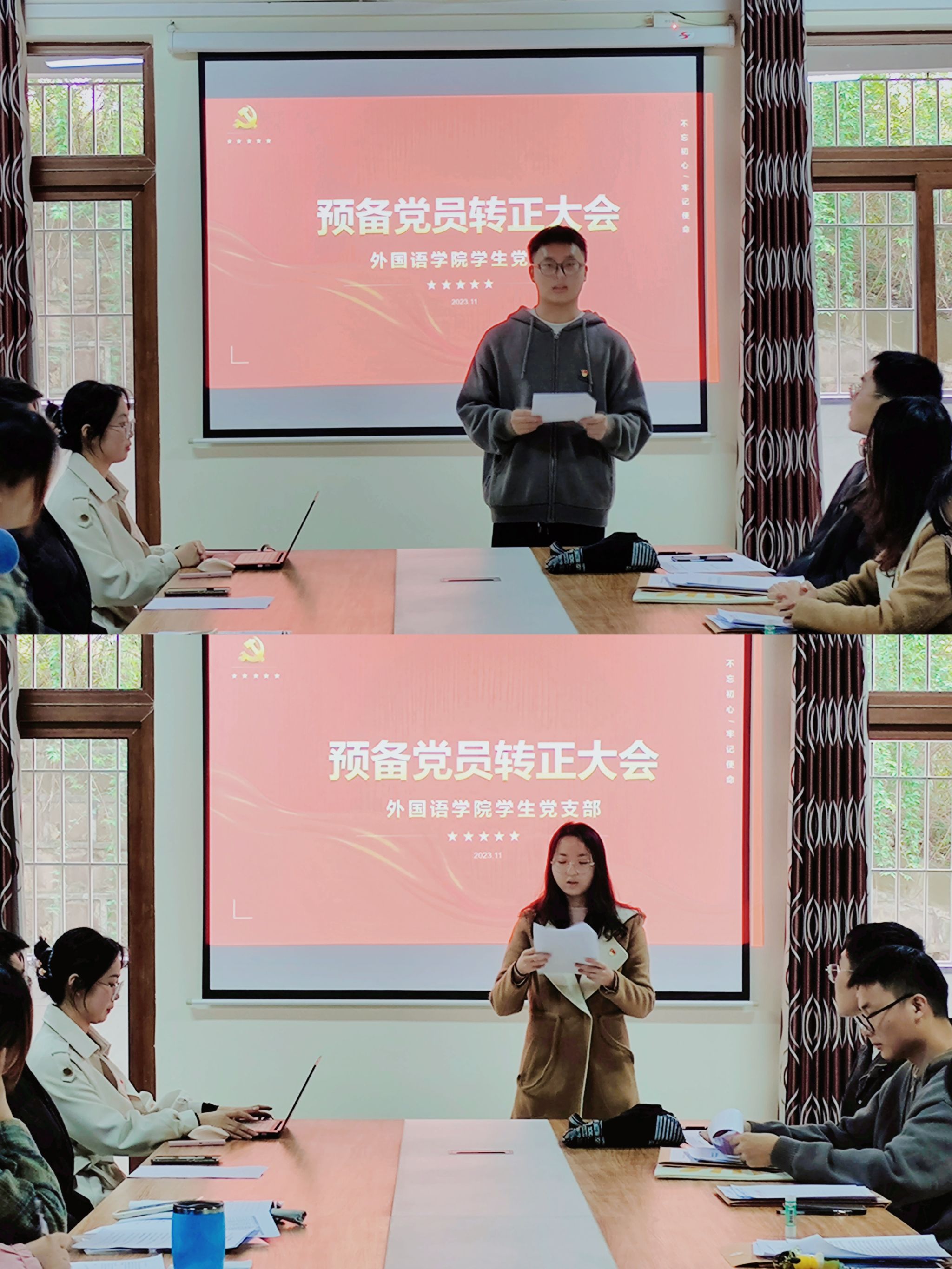 此次活动中我们还进行了外国语学院学生党支部预备党员转正大会和预备党员接收大会。各位同志坚定的表情、激昂的讲话,无一不表达着对党的赤诚之心。愿各位同志不断完善自我,铭记此刻,今后更加严格要求自己,以初心,敬党心;以誓言,敬理想;以努力,敬时光;不忘初心,前路漫漫亦灿灿,愿以寸心寄华夏,且将岁月赠山河。